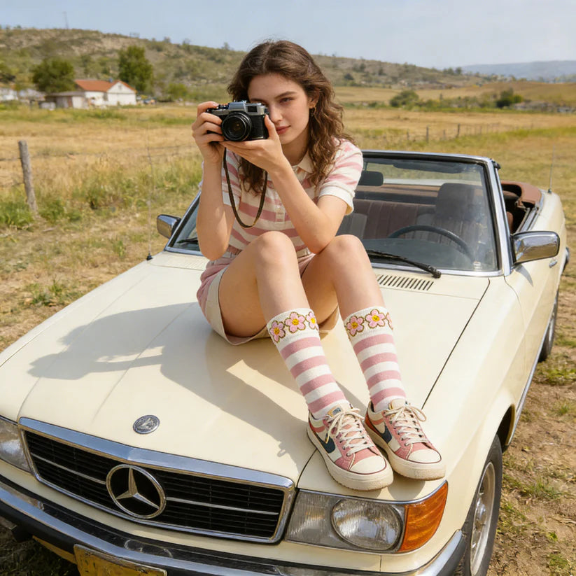 Soft Pink-White Striped Mid-Calf Socks with Floral Embroidery